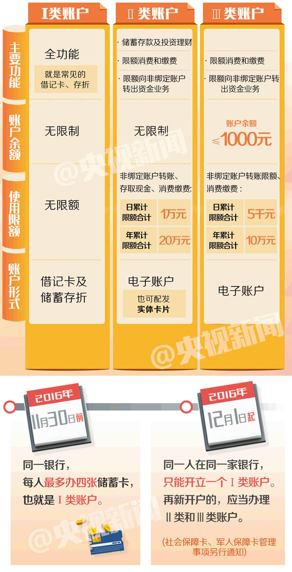 央行日前规定:自12月1日起,个人在银行开立账户,每人在同一家银行,只能开立一个Ⅰ类户,如果已经有Ⅰ类户的,再开户时只能是Ⅱ、Ⅲ类账户。>>3天后 你的银行账户可能发生一个大变动